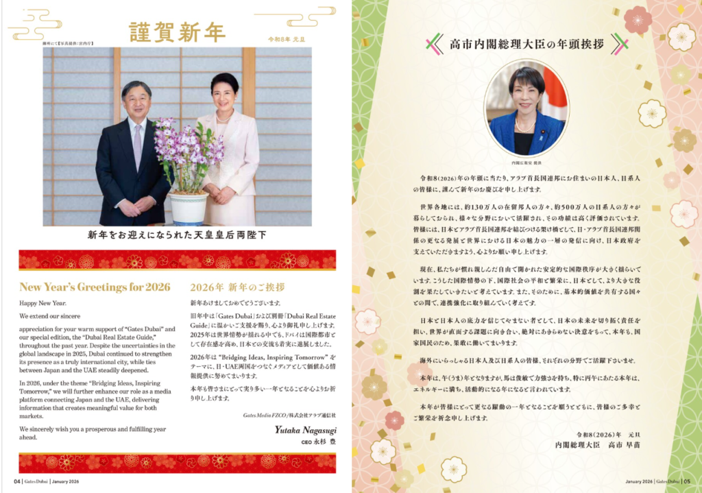 天皇皇后両陛下・内閣総理大臣・外務大臣・現地王族からのお姿・ご挨拶により、新年の晴れやかな幕開けと新たな一年への期待感をご覧いただけます。是非ともご一読頂き、ドバイ事業を含めた海外事業のみならず、弊法人の他の事業も併せて、今年も皆様方のお役に立てますよう、努力して参りますので、何卒宜しくお願い致します。