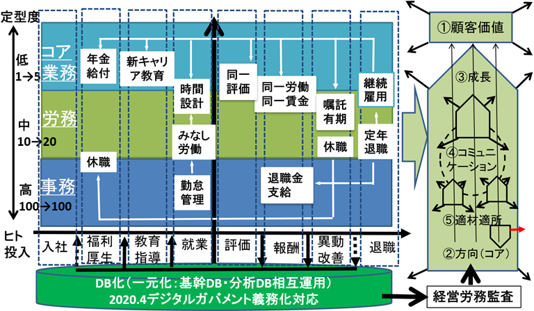 最後に左図最下段に「DB化」とあるのがまさにDX:データ・トランスフォメーション部分を表し、上記24マスの各業務により人事ライフサイクル及び人事PDCAサイクルを円滑に回転するのをデータ起点で支援することを表します。24マスの各業務に対してデータベースの項目を設定して、各業務を「ⅴデータ起点で設計」します。さらに、各データからヒトの動きが計測されるので、各種分析(経営労務監査等)に利用できます。