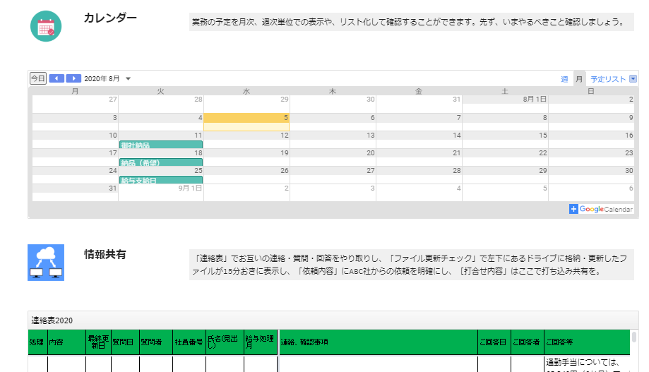 その下に連絡表・共有ドライブ・ファイル一覧・依頼内容一覧と、すべての情報共有の場所(以下「情報共有スペース」)があり、そこで様々な情報を共有することができます。