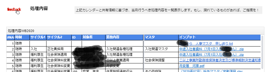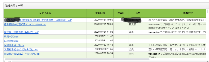 - 給与計算や社会保険手続等が完了した場合に、成果物は共有ドライブ等で格納され、情報共有スペースで確認することができます。また、成果物納品だけではなく、その都度、弊社側でどのような内容の処理を行っているかを「処理内容」という一覧表上で確認することができます。