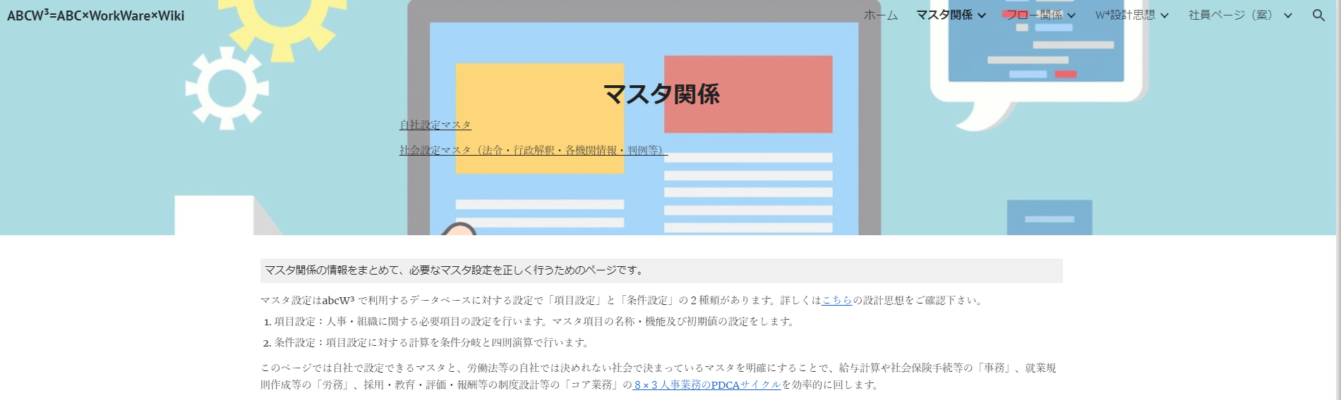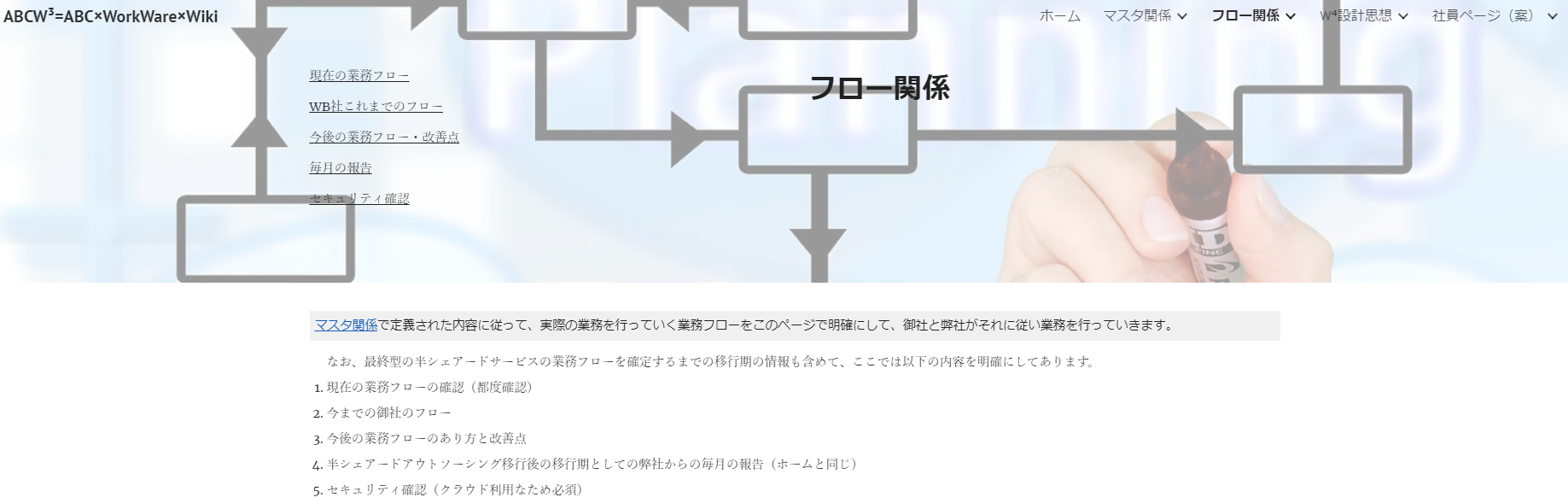 弊社と顧客の契約業務遂行に関する(やりとりも含め)すべてのことが、このサイトで明確になることを目的としています。なお、見た目はWikiのような共有サイトですが、プラットフォームとしてあるは、勤怠・人事統合クラウドソフト「ワークウェア」というビジネスロジックが埋め込んであり、動的な情報が生成されるためです。